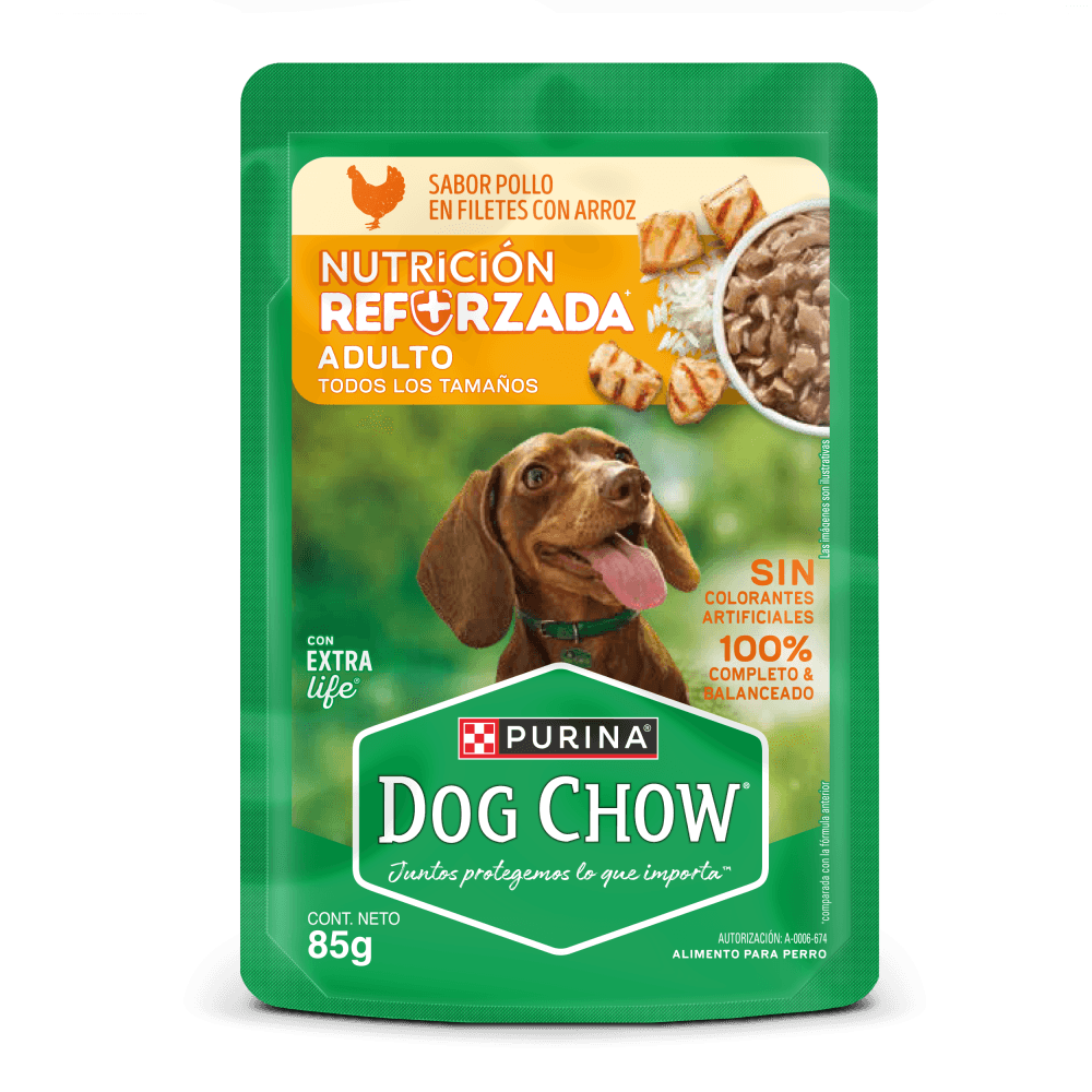 Calcio para dientes fuertes. Sin adición de conservantes artificiales.; Modo de uso:; Agua, carne de pollo congelada, gluten y/o harina de trigo, subproductos de pollo y/o cerdo congelados, almidón de maíz, harina de soya/soja y/o harina de subproductos de pollo, arroz, carne vacuna (res) congelada, sal*, carbonato de calcio, cloruro de potasio, fosfato bicálcico y/o zeolita, colorante caramelo natural, vitaminas (A, B1, B2, B3, B5, B6, B7, B9, B12, D3, E, K3), minerales [(sulfatos: zinc, hierro, manganeso, cobre), minerales de alta absorción/quelados (proteinato de zinc y/o complejo de zinc-glicina, proteinato de hierro y/o complejo de hierro-glicina, proteinato de manganeso y/o complejo de manganeso-glicina, proteinato de cobre y/o complejo de cobre-glicina, proteinato de selenio y/o complejo de selenio-glicina), yodato de calcio, selenito de sodio], taurina, cloruro de colina. *Sal (mín. /máx.): 0,2%-0,6%.; Ingredientes:; Alimento húmedo para perros Purina® Dog Chow® Nutrición Reforzada sabor a pollo en filetes con arroz que ayudan a su hidratación diaria y a mantener su calidad de vida para adultos todos los tamaños; |