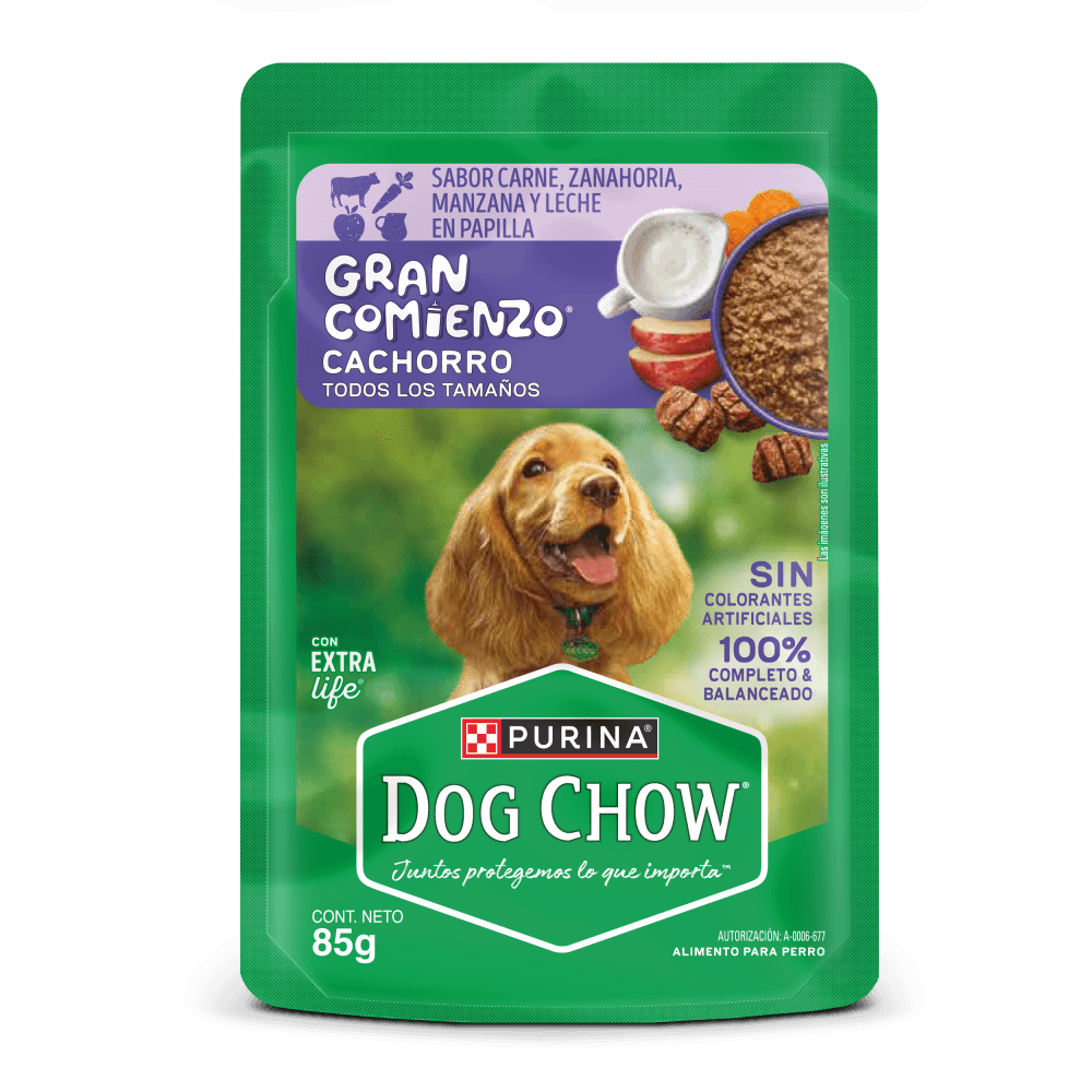 Calcio para dientes fuertes. Sin adición de conservantes artificiales.; Modo de uso:; Agua, carne de pollo congelada, gluten y/o harina de trigo, subproductos de pollo y/o cerdo congelados, almidón de maíz, harina de soya/soja y/o harina de subproductos de pollo, arroz, carne vacuna (res) congelada, sal*, carbonato de calcio, cloruro de potasio, fosfato bicálcico y/o zeolita, colorante caramelo natural, vitaminas (A, B1, B2, B3, B5, B6, B7, B9, B12, D3, E, K3), minerales [(sulfatos: zinc, hierro, manganeso, cobre), minerales de alta absorción/quelados (proteinato de zinc y/o complejo de zinc-glicina, proteinato de hierro y/o complejo de hierro-glicina, proteinato de manganeso y/o complejo de manganeso-glicina, proteinato de cobre y/o complejo de cobre-glicina, proteinato de selenio y/o complejo de selenio-glicina), yodato de calcio, selenito de sodio], taurina, cloruro de colina. *Sal (mín. /máx.): 0,2%-0,6%.; Ingredientes:; Alimento húmedo para perros cachorros Purina® Dog Chow® Gran Comienzo sabor a carne, zanahoria, manzana y leche en papilla, que ayudan a su hidratación diaria y a mantener su calidad de vida para todos los tamaños; |