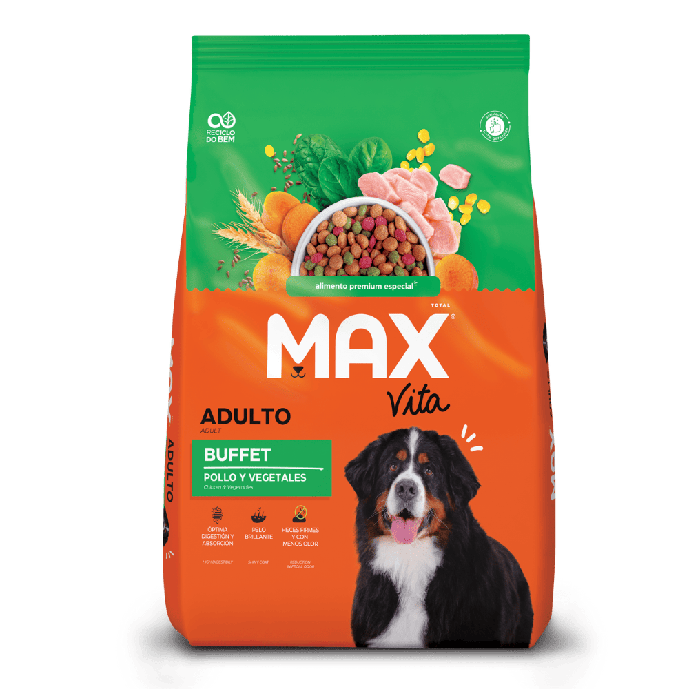 Max Vita es un alimento balanceado para perros adultos de todas las razas, formulado con el sello VITA COMPLEX que garantiza una nutrición completa y equilibrada para el bienestar diario de tu mascota.; Beneficios.; 1. Contiene prebióticos y extracto de yuca que ayudan a reducir el olor de las heces y favorecen una digestión saludable.; 2. Aporta niveles adecuados de proteína y Omega 6 para el mantenimiento de una piel sana y un pelaje brillante.; 3. La crocancia del alimento contribuye a la reducción de la formación de sarro y apoya la limpieza dental.; Modo de uso.; Alimento balanceado indicado para perros adultos de todas las razas.; Servir la ración diaria recomendada según el peso y nivel de actividad.; Almacenar en un lugar fresco y seco.; Consulte al médico veterinario.