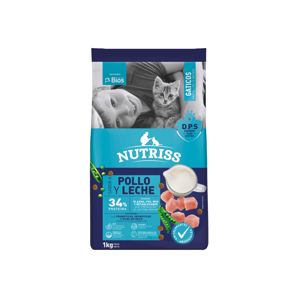 Descripción | Nutriss Sabores Gaticos Pollo y Leche, provee de todos los nutrientes que requiere un gatito desde el destete hasta que cumplan el año de edad, para crecer, desarrollarse y tener un óptimo funcionamiento del sistema nervioso central, del sistema digestivo y del sistema inmune; Ingredientes: Harina de pollo, arroz, harina de carne de cerdo y res, arveja, grasa de pollo, maíz, torta de soya, plasma bovino, *Saccharomyces cerevisiae*, hidrolizado de pollo, leche deslactosada, pulpa de remolacha, zeolita, algas *Schizochytrium spp* (omega 3 y fuente de DHA). Prebióticos: fructooligosacáridos, mananoligosacáridos y betaglucanos. Inulina. Ácido butírico. Probióticos: *Enteroccocus faecium*, *Bacillus subtilis* y *S. boulardii*. Cloruro de potasio, cloruro de sodio, extracto de *Yucca schidigera*. Minerales: manganeso orgánico, sulfato de manganeso, cobre orgánico, sulfato de cobre, zinc orgánico, óxido de zinc, hierro orgánico, sulfato ferroso, yodato de calcio, selenio orgánico, cromo orgánico. Vitaminas: A, C, D3, E, K, B12, tiamina, piridoxina, riboflavina, niacina, ácido pantoténico, ácido fólico, biotina, cloruro de colina. Aminoácidos: DL-metionina, taurina, L-triptófano. Antioxidantes naturales: extracto de romero; Contraindicaciones: Prohibido su uso en alimentación de rumiantes; mantener fuera del alcance de los niños; almacenar el producto en el empaque original, cerrado, en un lugar seco y fresco; se recomienda conservar por debajo de 35?°C y por debajo de 65?% de humedad relativa; producto de uso veterinario de venta libre; este producto no presenta ninguna incompatibilidad, ni antagonismo según los insumos utilizados en la alimentación animal.
