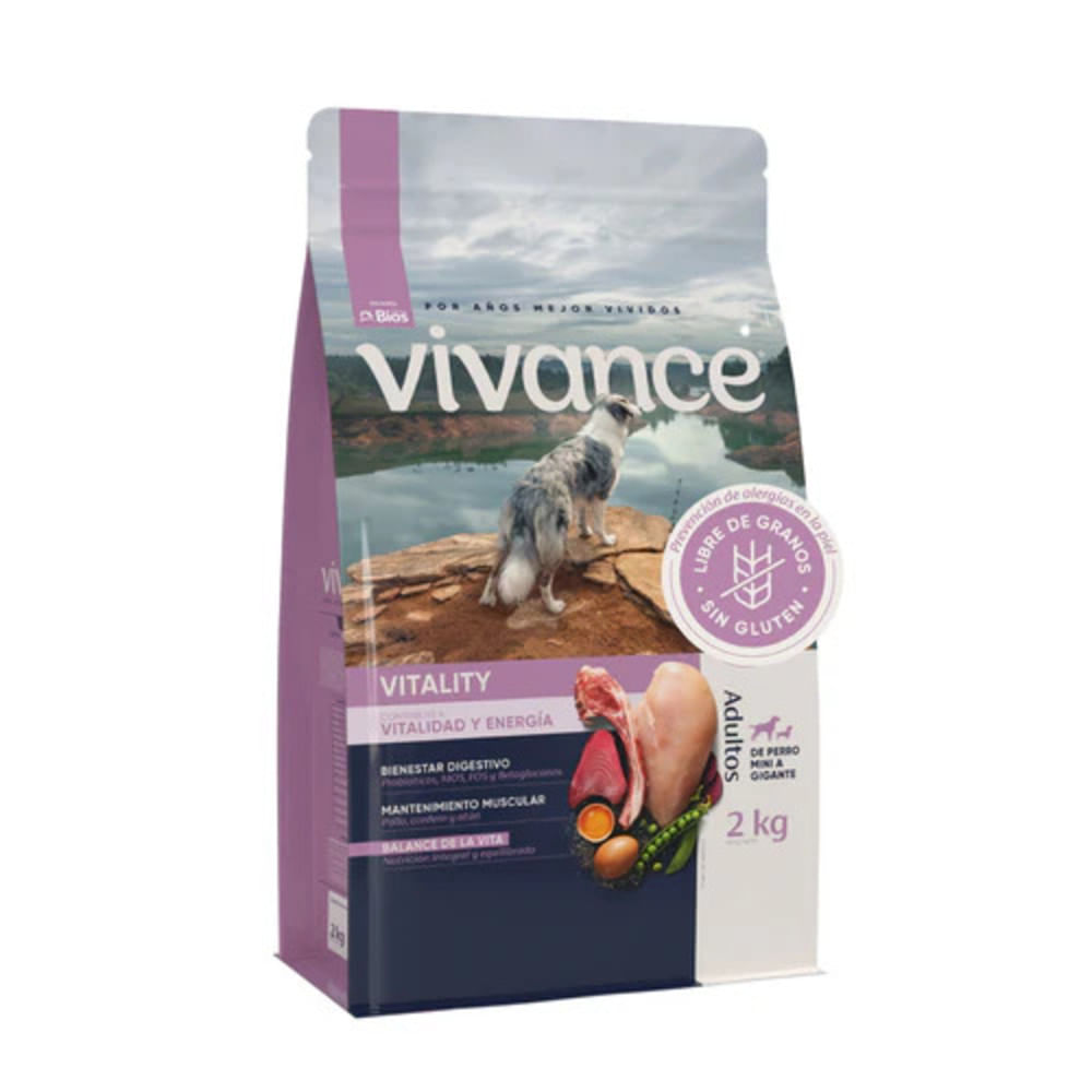 Descripción | Vivance Vitality Adultos es un producto libre de granos, con proteína de pollo, cordero, atún y huevo que contribuyen a la vitalidad y energía del perro; con ingredientes funcionales como la pulpa de remolacha, que favorece el bienestar digestivo, y semillas de chía, que ayudan a la salud de la piel y el pelaje; en Vivance buscamos aportar en la nutrición de su cuerpo y de su alma; Ingredientes: Harina de pollo, almidón de yuca, harina de cordero, arveja, aceite de pollo, pulpa de remolacha, harina de atún, *Saccharomyces cerevisiae*, semillas de chía, hidrolizado de pollo, huevo deshidratado. Prebióticos: fructooligosacáridos, mananoligosacáridos y betaglucanos. Alga *Schizochytrium spp* (fuente de DHA y EPA), zeolita, cloruro de sodio, inulina. Probióticos: *Enterococcus faecium*, *Bacillus subtilis*, *S. boulardii*, *Lactobacillus spp*, *Bifidobacterias spp*. Extracto de quillaja, cloruro de potasio. Minerales: manganeso orgánico, cobre orgánico, zinc orgánico, hierro orgánico, yodato de calcio, selenio orgánico, cromo orgánico. Vitaminas: A, C, D3, E, K, B12, tiamina, piridoxina, riboflavina, niacina, ácido pantoténico, ácido fólico, biotina, cloruro de colina. Aminoácidos: DL-metionina, L-arginina, L-triptófano, taurina. Antioxidantes naturales: extracto de romero; Contraindicaciones: Prohibido su uso en alimentación de rumiantes; mantener fuera del alcance de los niños; almacene el producto en el empaque original, cerrado, en lugar seco y fresco; se recomienda conservar por debajo de 35?°C y por debajo de 65?% de humedad relativa; producto de uso veterinario de venta libre; este producto no presenta ninguna incompatibilidad ni antagonismo según los insumos utilizados en la alimentación animal.