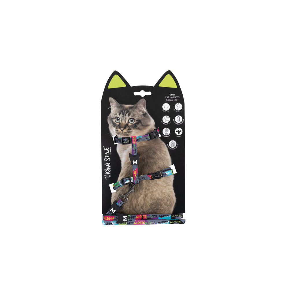 Set de arnés y correa para gatos diseñado para ofrecer seguridad, comodidad y estilo en cada paseo. Su diseño multicolor con inspiración urbana aporta personalidad, mientras su estructura ajustable garantiza un ajuste seguro y confortable.; Beneficios.; Proporciona mayor control y seguridad en paseos; Ofrece un ajuste cómodo y adaptable; Aporta un estilo moderno y llamativo; Ideal para uso diario.; Características.; Incluye arnés y correa de 120 cm de longitud; Ajustable para cuello de 20–30 cm y pecho de 30–42 cm; Hebillas bloqueables que refuerzan la seguridad; Diseño resistente y ligero; Lavable a máquina a 30 °C.; Material.; Fabricado en poliéster con componentes de hierro, POM, PVC y aleación de zinc, materiales resistentes diseñados para durabilidad y uso frecuente.