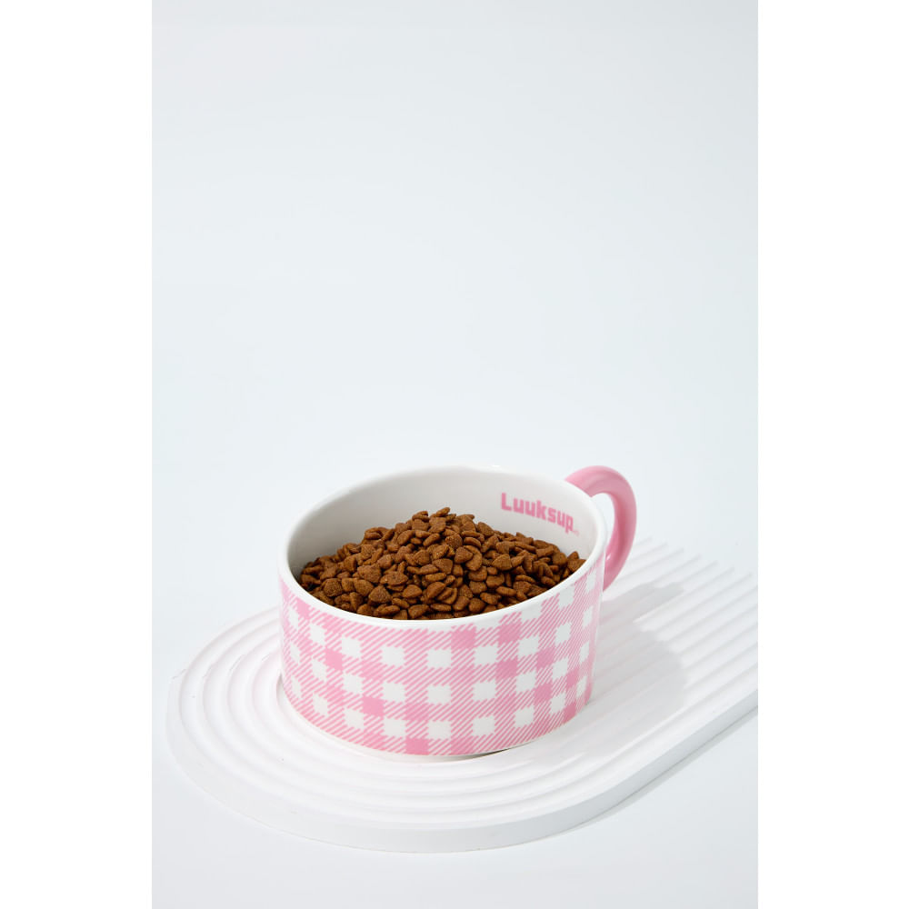 Comedero cerámico con diseño tipo taza y detalle de cuadrícula decorativa, ideal para servir alimento o agua de forma práctica y estética.; Su ángulo ergonómico favorece una postura más cómoda durante la alimentación.; Medidas:; 20.5 × 14 × 7.6 cm.; Capacidad:; 550 ml.; Beneficios:; Diseño decorativo y funcional.; Ángulo ergonómico para una alimentación cómoda.; Tamaño ideal para porciones balanceadas.; Fácil de limpiar.; Apto para lavavajillas.; Material:; Cerámica.