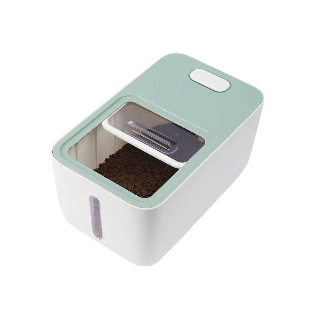 Contenedor de alimento BOXI con capacidad de 10 L (38 x 22.5 x 18 cm) - Soporta hasta 10 kg de alimento; Incluye palita dosificadora y apertura deslizante para un uso práctico; Cuenta con ventana transparente que permite visualizar el nivel de alimento; Diseño antideslizante con 2 ruedas para fácil desplazamiento; Cierre hermético con 2 bandas de goma que conservan la frescura; Fabricado en materiales resistentes y seguros, libre de BPA.Material: PP, ABS