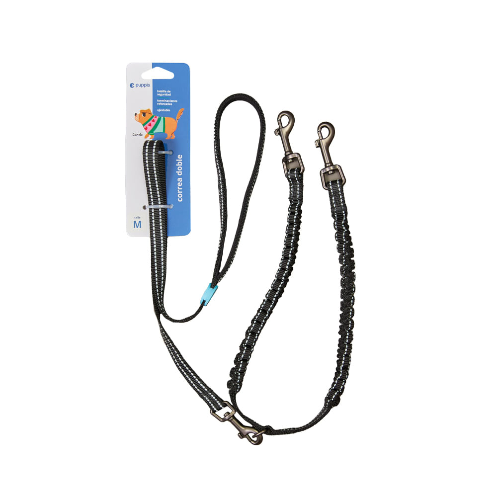 Material resistente y duradero.; Fácil de colocar y asegurar.; Permite pasear a dos perros al mismo tiempo.; Sistema amortiguado que reduce los tirones.; Mango cómodo que ofrece un mejor control.