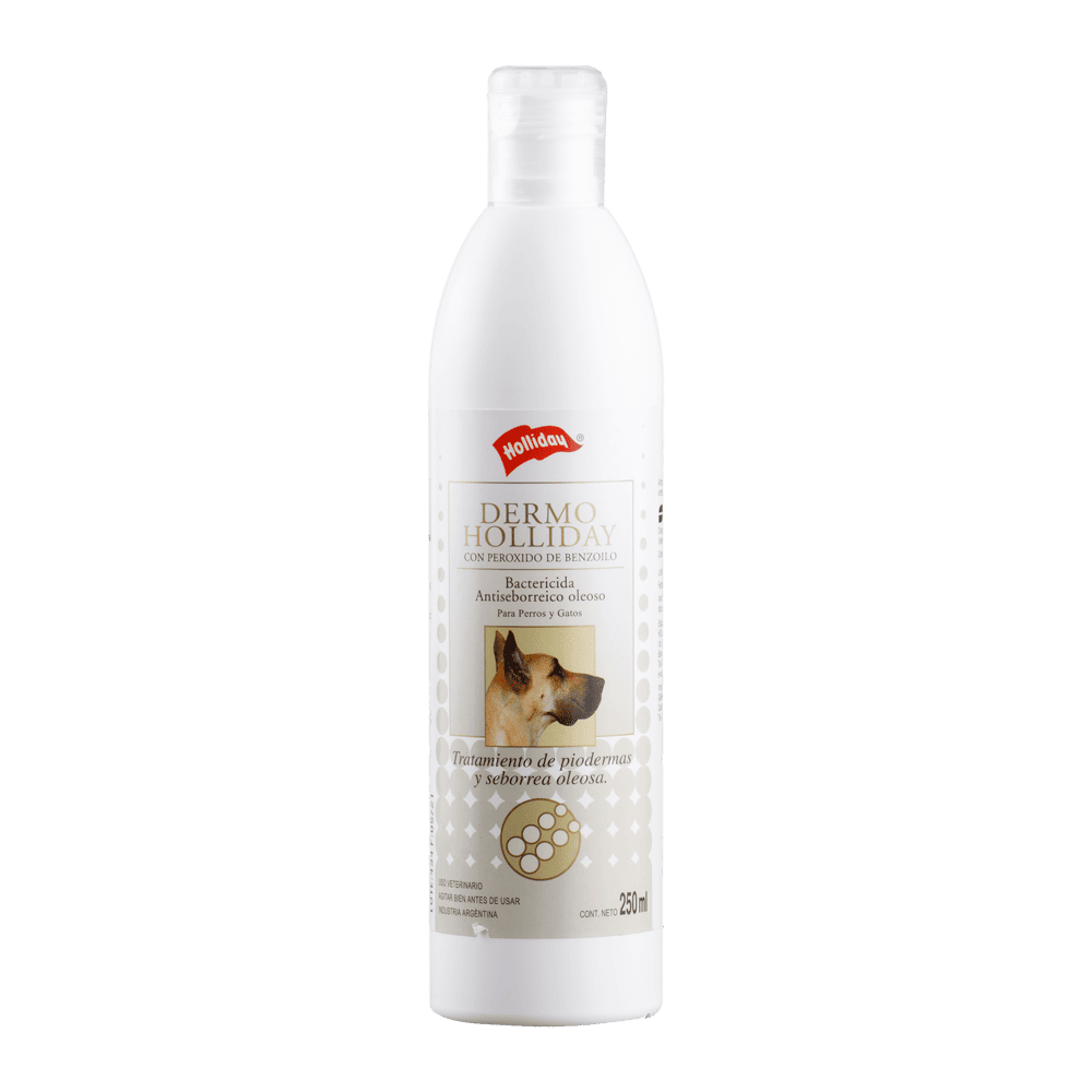 Shampoo de acción antiséptica y antiseborreica oleosa, indicado para el manejo de afecciones dermatológicas en mascotas. Presentación en envase de 250 ml con cámara de aire que permite su correcta agitación; contiene una bolilla inerte para facilitar la homogenización del producto.; Composición:; Cada 100 ml de la solución contiene Peróxido de Benzoilo 2,5 g y excipientes c.s.; Indicaciones:; Indicado en piodermias, procesos seborreicos oleosos, foliculitis, impétigo y acné felino. Actúa como coadyuvante en el tratamiento de la demodicosis. También puede utilizarse para el lavado y antisepsia del campo quirúrgico, complementando el uso de solución de Clorhexidina en spray.; Beneficios:; 1. Antiséptico bactericida de amplio espectro. 2. Combate la seborrea oleosa gracias a su acción sebostática sobre las glándulas sebáceas. 3. Presenta efecto rubefaciente folicular y buena actividad queratolítica.