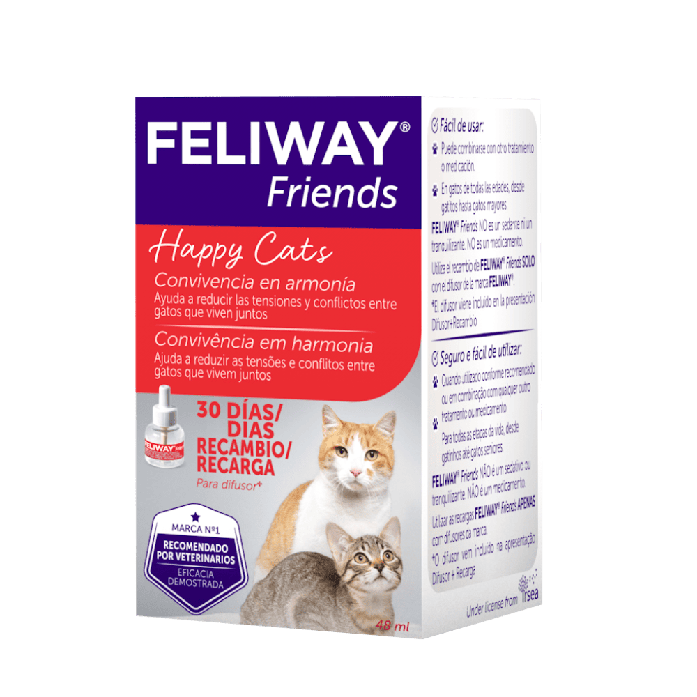 Feliway Friends ayuda a mejorar la relación y la convivencia entre gatos que viven juntos, reduciendo los signos de tensión y conflicto en el hogar.; Su acción favorece un ambiente más armonioso en un corto periodo de tiempo.; Composición: Copia sintética de la feromona de apaciguamiento felina 2 %, hidrocarburo isoparafínico c.s.p. 100 ml.; Modo de uso: enrosca el vial en el difusor y conéctalo a un enchufe, asegurando que el recipiente con el líquido quede siempre en posición vertical con el recambio hacia abajo.; Ayuda a reducir los signos de tensión grupal entre varios gatos.; Resultados visibles aproximadamente desde los 7 días, con una eficacia sostenida de hasta 30 días.; No contiene aromas que alteren el entorno ni afecten la convivencia.