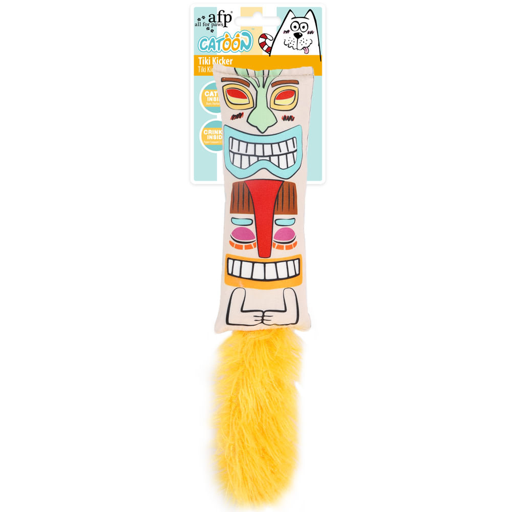 Juguete interactivo tipo kicker para gatos con diseño de tótem Tiki, pensado para estimular el juego activo y sensorial. Su forma alargada y su cola esponjosa lo convierten en un objetivo ideal para que el gato lo abrace con las patas delanteras mientras lo patea con las traseras, promoviendo un comportamiento natural de caza y juego.; Beneficios.; Estimula el ejercicio físico y la actividad mental; Reduce el aburrimiento y el estrés; Favorece la liberación de energía acumulada; Refuerza los comportamientos naturales de caza y persecución.; Características.; Diseño llamativo con colores vibrantes y forma alargada tipo kicker; Relleno con catnip de alta calidad que aumenta el interés y el tiempo de juego; Dimensiones aproximadas de 34 × 8 × 5 cm, ideales para agarre, mordida y juego activo.; Material.; Fabricado en material textil suave y resistente, con relleno de catnip que potencia la estimulación y la interacción del gato.