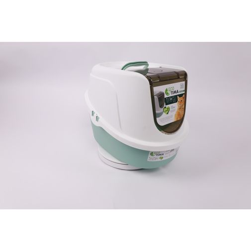Fabricado con materiales reciclados que respetan el medio ambiente.; Facilita el acceso del gato gracias a su puerta abatible.; Incluye filtro que ayuda a mantener el hogar libre de olores.; El diseño con escalón evita la dispersión de arena.; La cubierta desmontable permite una limpieza más práctica.; Asa superior que facilita su transporte.