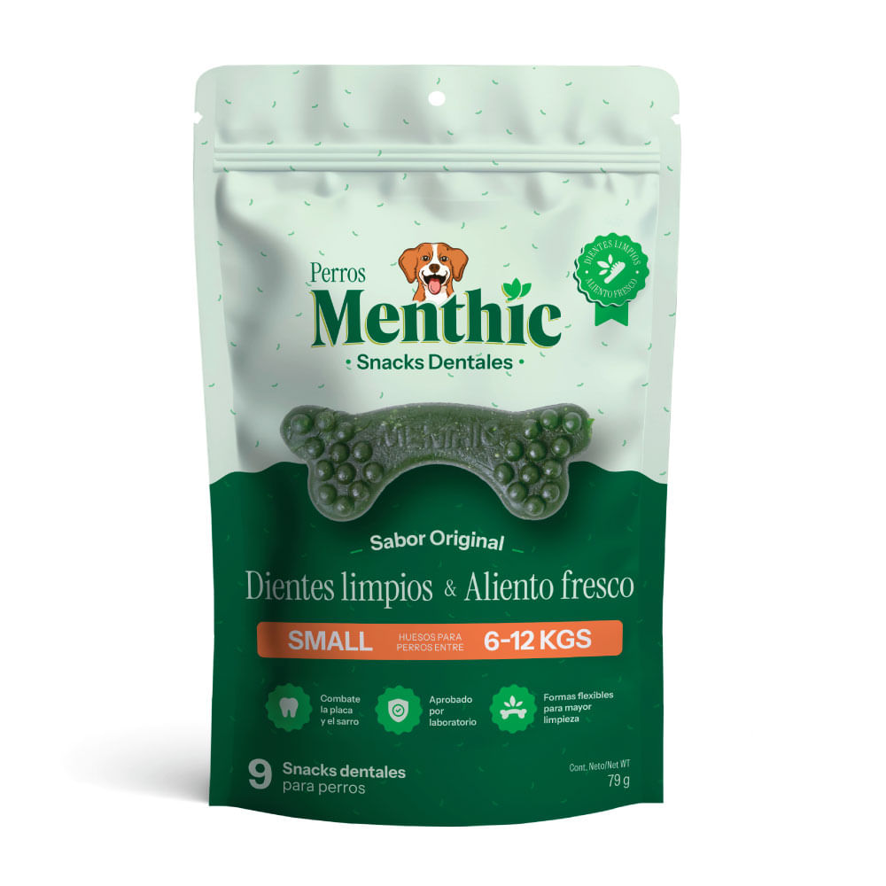 Menthic Dental Treats en forma de sticks son la solución perfecta para mantener la salud dental de tu perro. Elaborados con ingredientes 100% naturales, estos sticks no solo ayudan a eliminar el sarro y la placa, sino que también refrescan el aliento de tu peludo. Con Menthic puedes estar seguro de que le estás brindando a tu perro un cuidado dental eficaz y saludable. Paquete por 79 gramos y 9 unidades. Huesos talla Small, recomendable para perros entre 6-12 kg.