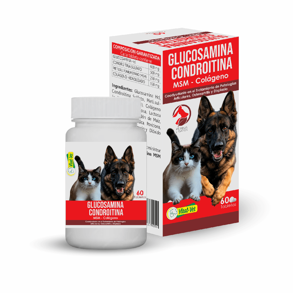 Sumplementación de Glucosamina Condroitina MSM - Colágeno coadyudante en el tratamiento de patologias articulares, osteoartritis y displacias.; Beneficios:; Glucosamina Condroitina MSM -Colágeno alivia la rigidez y dolor articular, reduce la inflamación, mejora la movilidad general y ayuda al desarrollo saludable de los ligamentos.; Modo de uso:; Glucosamina Condroitina MSM -Colageno contiene Glucosamina Hcl, Condroitina sulfato, Metilsulfonilmetano (MSM), Colágeno Hidrolizado, Celulosa, Lactosa Monohidrato, Almidón de Maíz, Croscarmelosa Sódica, Povidona, Estearato de Magnesio y Dióxido de Silicio.; Ingredientes:; Seguir todas las indicaciones de uso.No utilizar este producto en especies diferentes a las recomendadas. Manténgase fuera del alcance de los niños .Manténgase en un lugar fresco, seco y protegido de la luz directa del sol.;