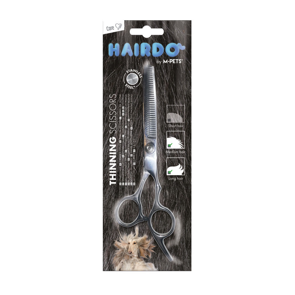 Tijera de entresacado diseñada para deslanar y desenredar el pelaje del perro de forma precisa y controlada.; Especialmente recomendada para razas de pelo largo o con pelaje denso, ayudando a reducir volumen y mejorar el acabado del corte.; Medidas:; 6 × 19 × 0.5 cm.; Tipo:; Tijera de entresacado.; Beneficios:; Ideal para reducir volumen y desenredar el pelaje.; Facilita el mantenimiento en perros de pelo largo o abundante.; Permite un acabado más uniforme.; Material:; Acero inoxidable.