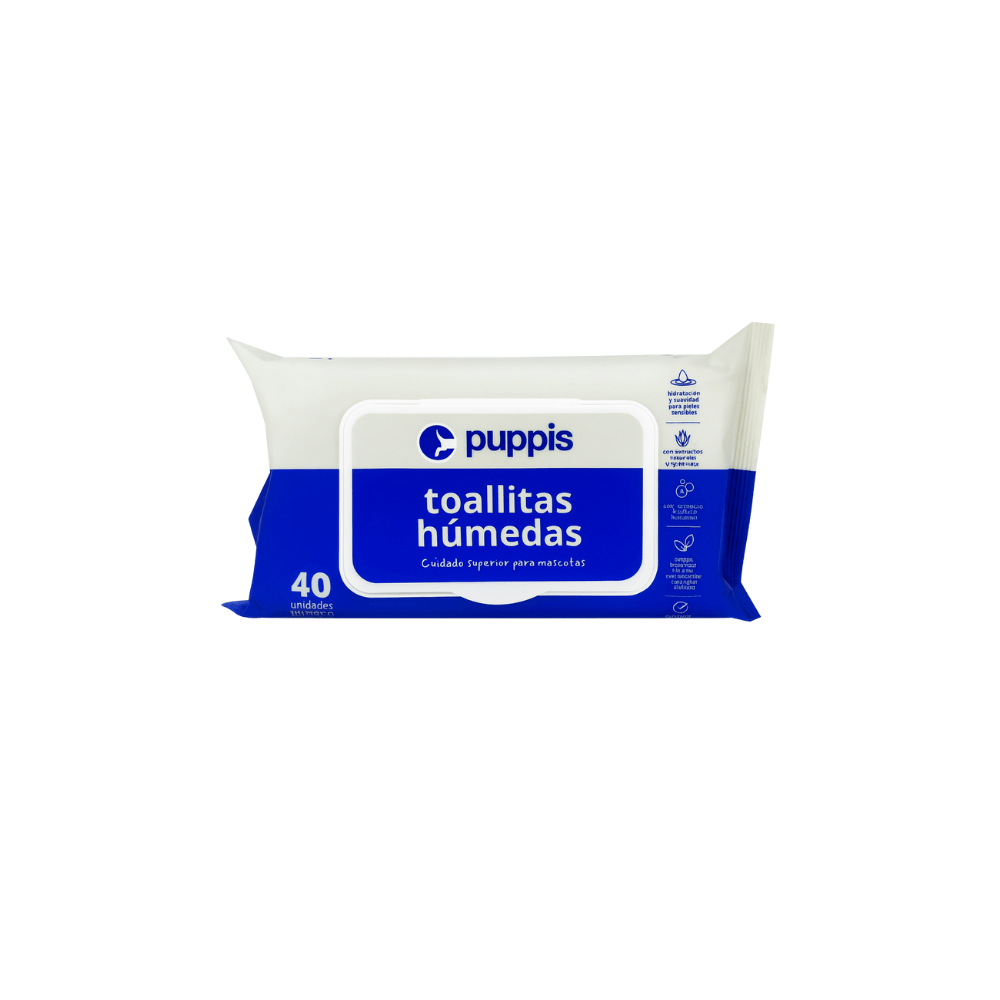 Toallitas húmedas con activos calmantes e hidratantes que ayudan a proteger y regenerar la piel. Diseñadas para ofrecer una limpieza diaria suave, incluso en áreas delicadas.; Beneficios:; Proporcionan hidratación y suavidad, ideales para pieles sensibles. Formuladas con extractos naturales de aloe vera y caléndula, con propiedades calmantes y antiinflamatorias. Enriquecidas con vitaminas A y E, y D-pantenol, que hidratan, protegen y regeneran la piel. Contienen agentes limpiadores suaves de origen vegetal y no incluyen alcohol etílico.; Uso recomendado:; Apta para uso diario en perros y gatos, incluso en zonas sensibles como patas, hocico y área íntima.