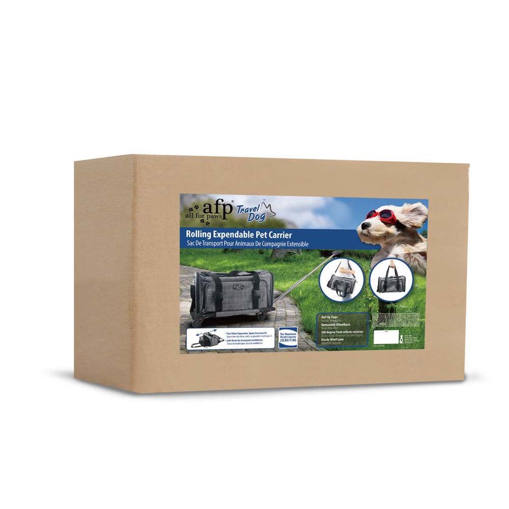 Transportadora portátil para mascotas – AFP; Cuenta con asa retráctil y ruedas para mayor comodidad; Asas de transporte extraíbles y correa de hombro ajustable; Se expande por dos lados, añadiendo actividades y espacio de descanso; Plataforma desmontable de 4 ruedas con bolsa de transporte plegable, fácil de montar y guardar; Tela de malla transpirable que garantiza ventilación y permite observar a la mascota.